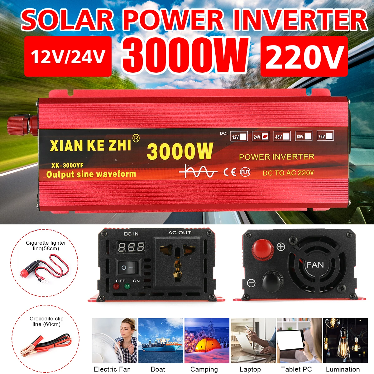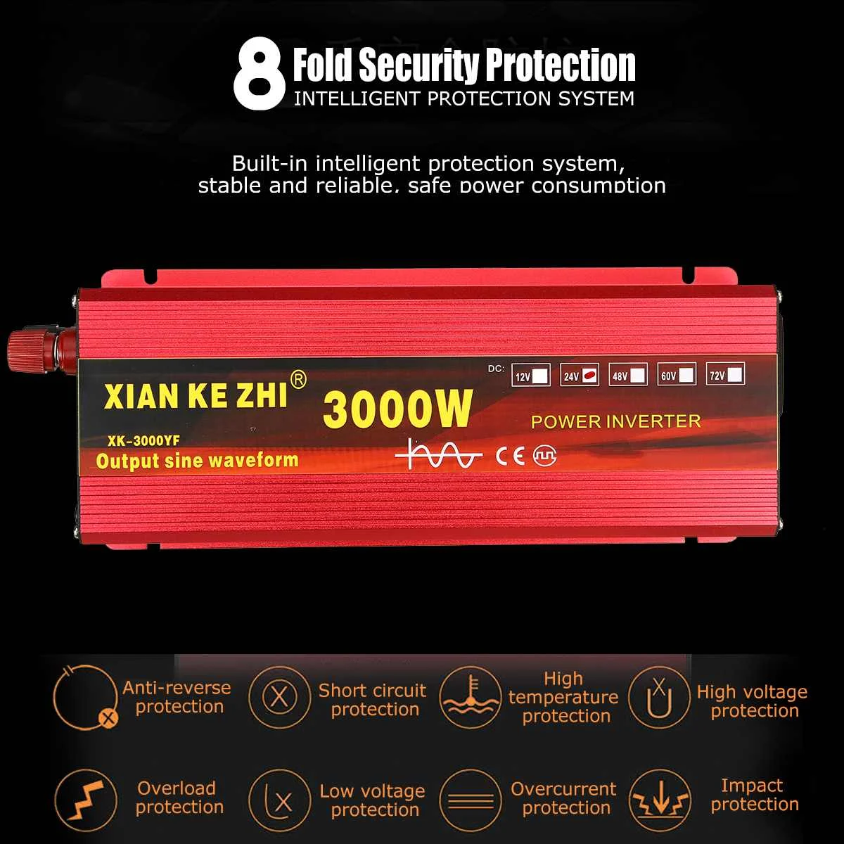2000W 3000W pur onduleur à onde sinusoïdale DC12 / 24 à ca 220V Portable voiture onduleur chargeur convertisseur adaptateur + affichage de LED