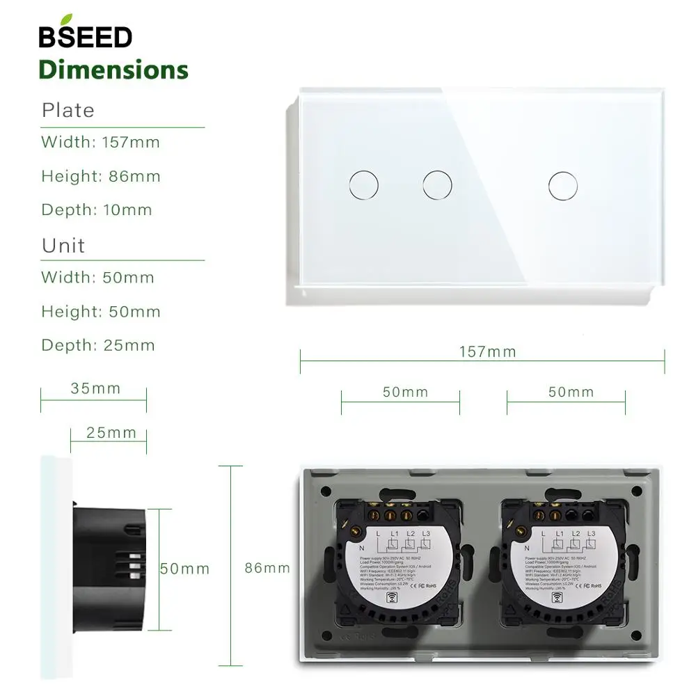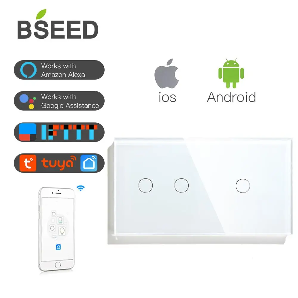 Bseed 1 Gang 2 Gang Wifi contrôle interrupteur interrupteur tactile interrupteur mural 3 couleur cristal classe panneau commutateur intelligent travail avec Tuya