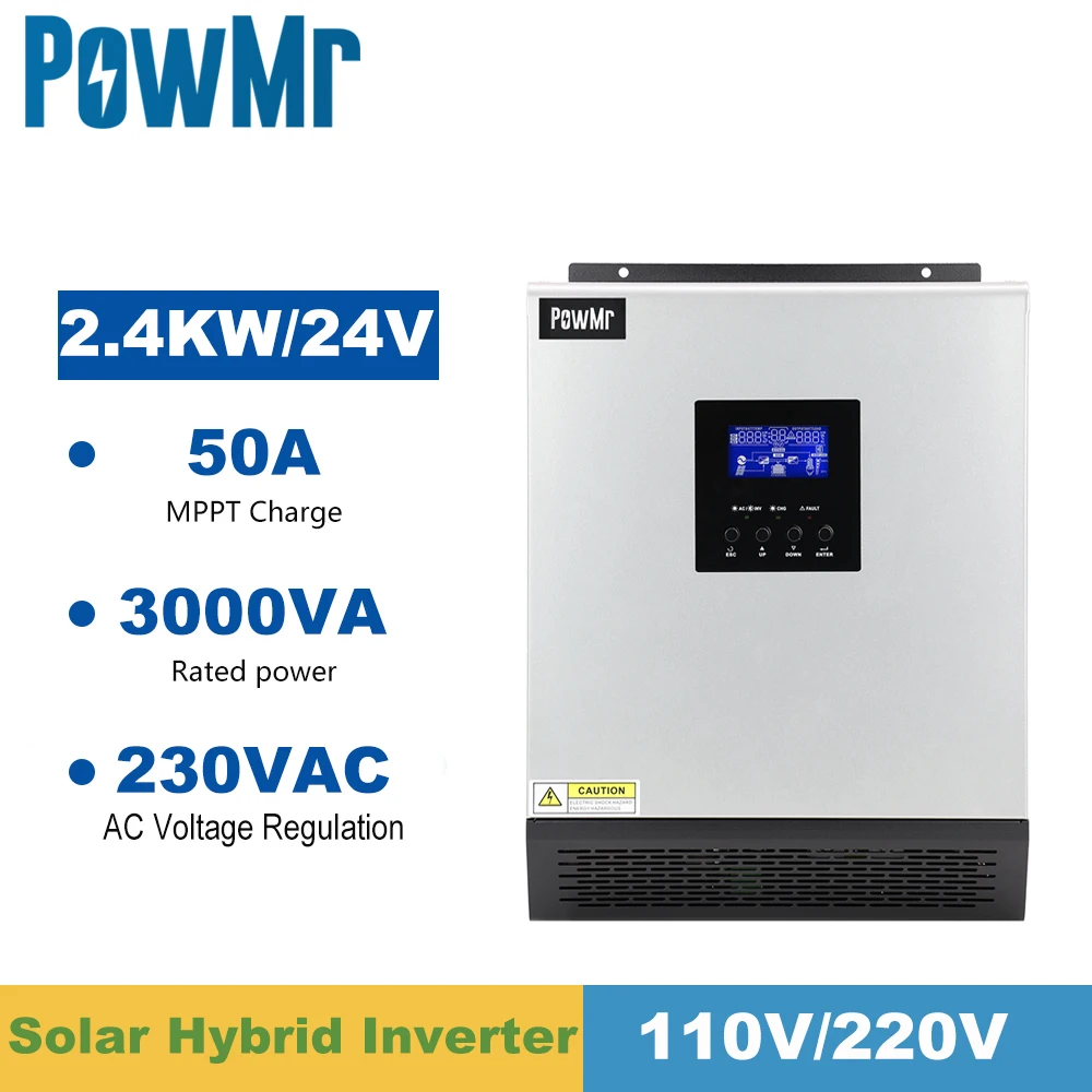 PowMr 3KVA onduleur solaire hybride à onde sinusoïdale Pure 24VDC entrée 220VAC 110VAC sortie 50A PWM contrôleur de chargeur solaire et chargeur ca